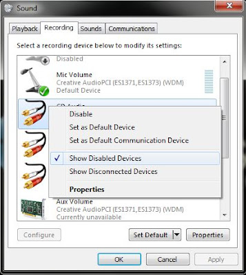 Jika sudah terbuka jendela baru,selanjutnya kamu pastikan semua device yang ada di “recording device” sudah di tampilkan semuanya,caranya klik kanan dan centang pada